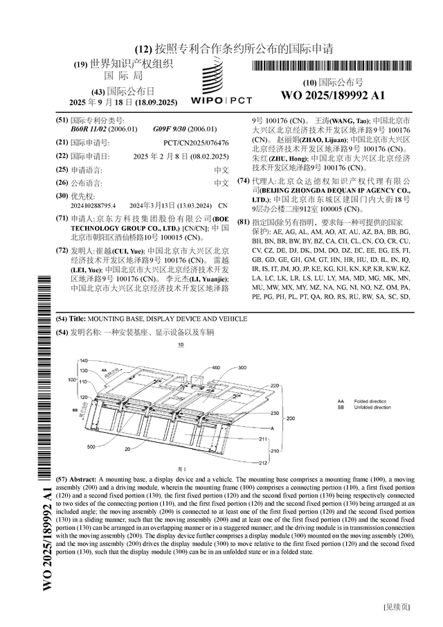 证券之星消息,根据企查查数据显示京东方A(000725)公布了一项国际专利申请,专利名为“一种安装基座、显示设备以及车辆”,专利申请号为PCT/CN2025/076476,国际公布日为2025年9月18日。