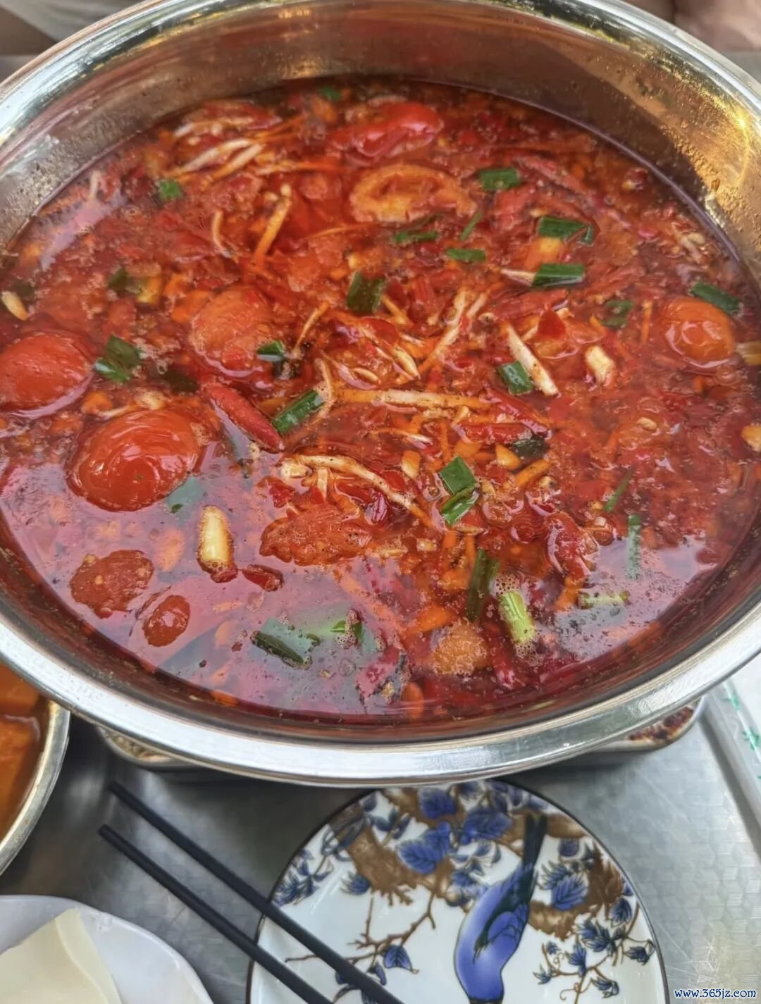汤底由野生小番茄和自制酸辣椒熬制,酸香浓郁,牛肉鲜嫩,鱼肉化渣,再蘸上由糊辣椒、折耳根和腐乳调制的蘸水,让人欲罢不能,吃得酣畅淋漓。